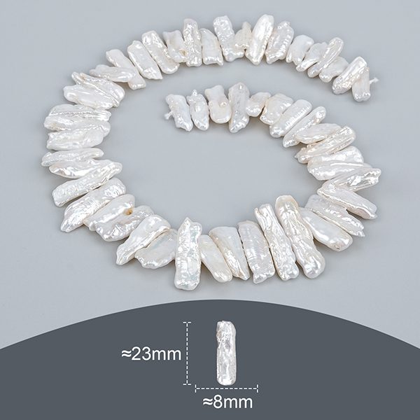 Biwa cultured baroque pearls (central perforated): Natural baroque mother-of-pearl pearls have an irregular and characteristic shape. They can take various shapes, such as irregular bumps, flattened shapes, or irregular natural contours.